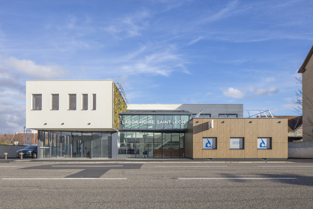 Parmi les projets réalisés à Colmar figure notamment le laboratoire Saint-Léon (Laboratoire Barrand), avec un travail architectural marqué sur la façade végétalisée, illustrant la capacité à intégrer des solutions contemporaines dans un contexte urbain contraint.